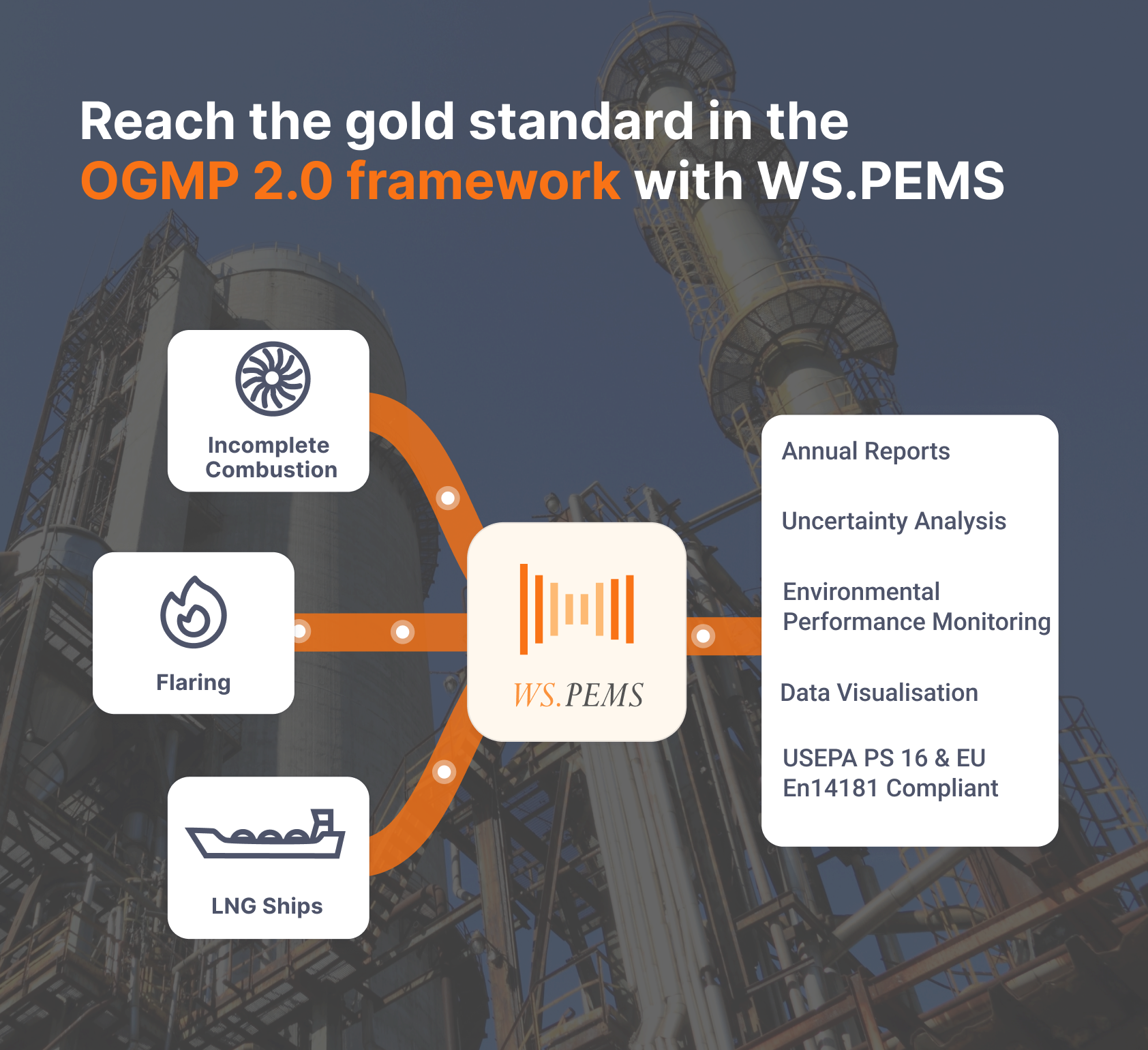 WS.PEMS is a predictive emission monitoring system that is already being used by companies in the oil and gas industry today. We understand the importance of the Oil & Gas Methane Partnership 2.0 (OGMP 2.0) and we can help companies meet these guidelines and thereby be recognized as OGMP 2.0 gold standard companies.